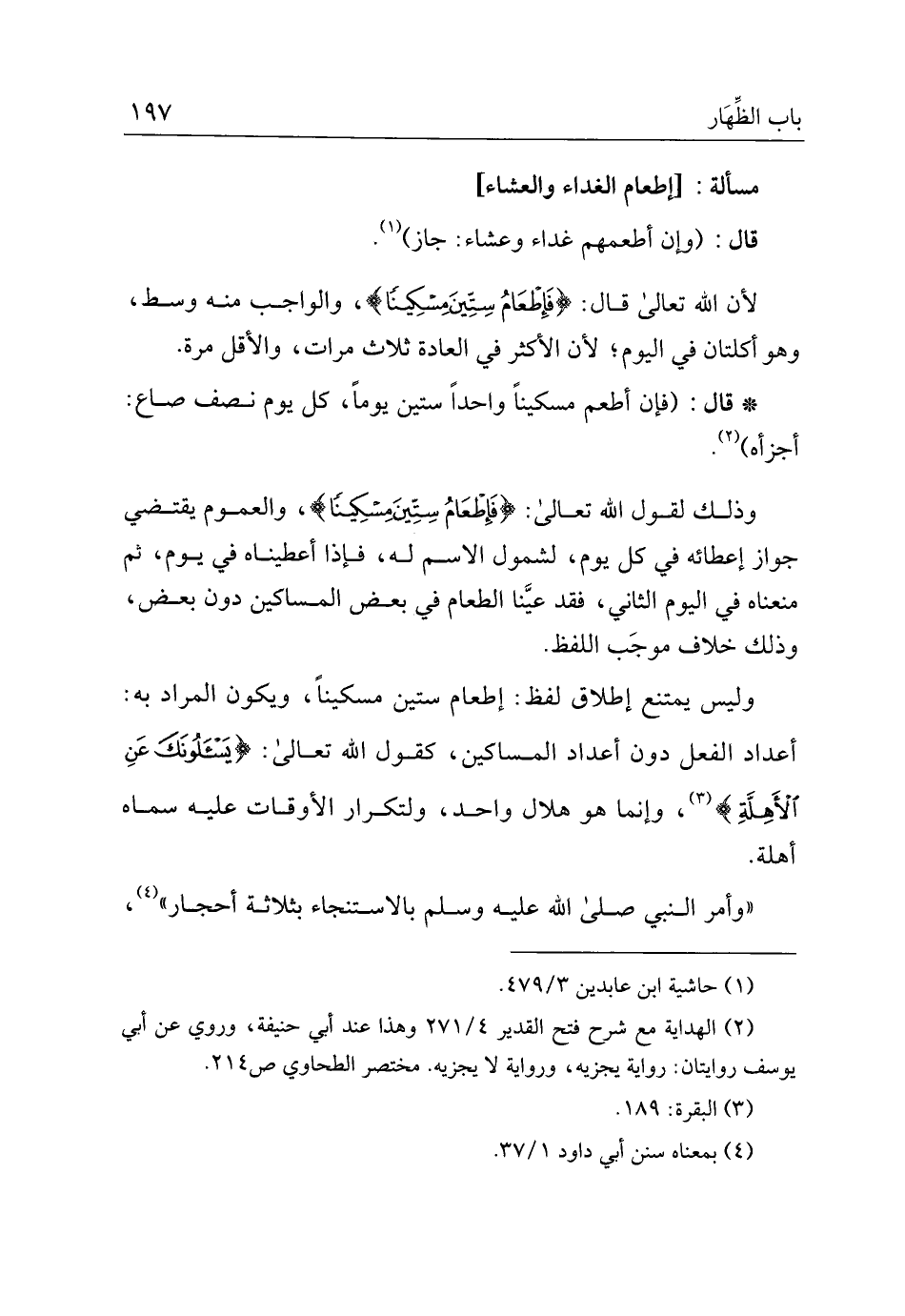 وليس يمتنع إطلاق لفظ: إطعام ستين مسكينًا، ويكون المراد به: أعداد الفعل دون أعداد المساكين، كقول الله تعالى: {يسألونك عن الأهلة}، وإنما هو هلال واحد، ولتكرار الأوقات عليه سماه أهلة.