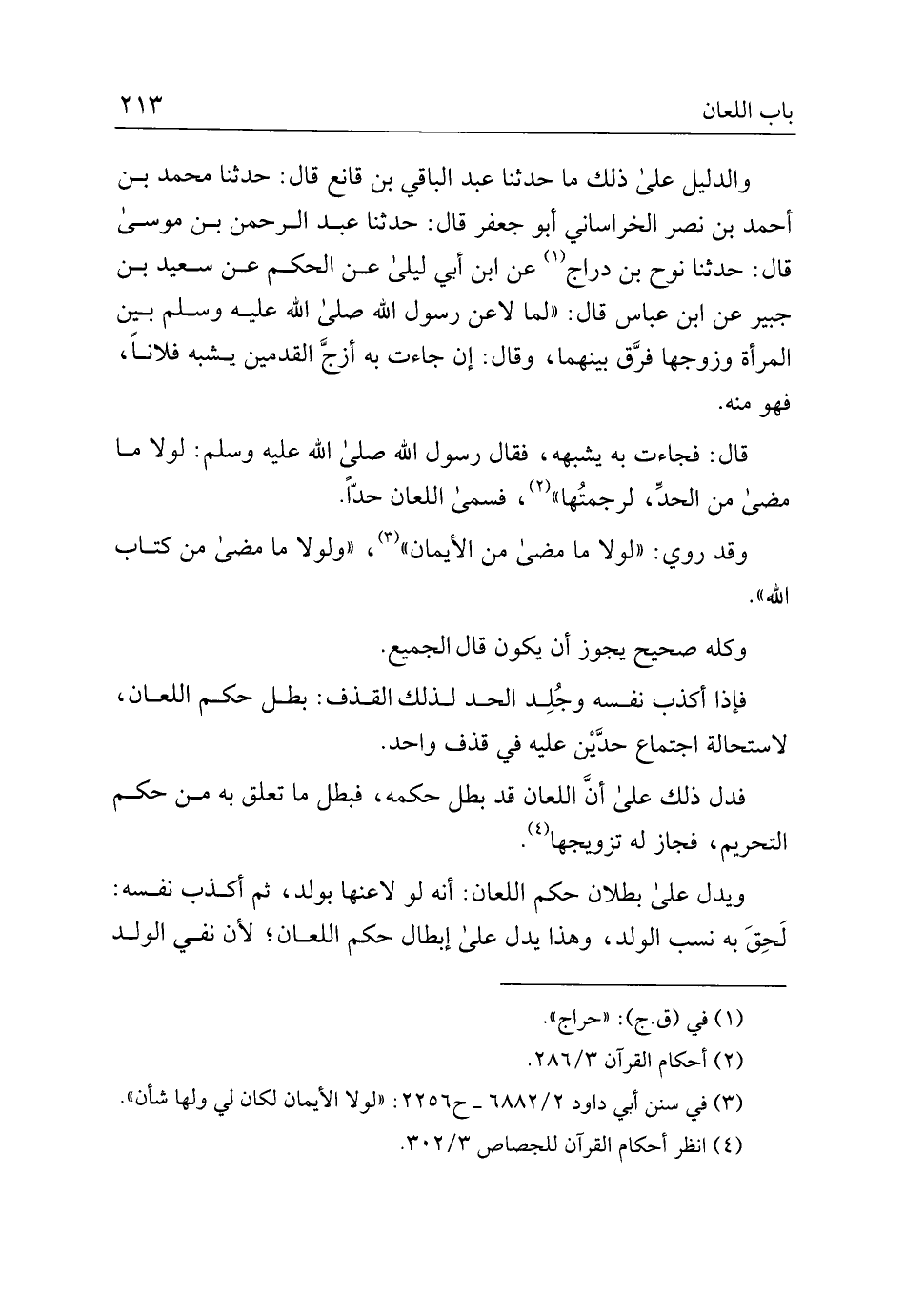 والدليل على ذلك ما حدثنا عبد الباقي بن قانع قال: حدثنا محمد بن أحمد بن نصر الخراساني أبو جعفر قال: حدثنا عبد الرحمن بن موسى قال: حدثنا نوح بن دراج عن ابن أبي ليلى عن الحكم عن سعيد بن جبير عن ابن عباس قال: "لما لاعن رسول الله صلى الله عليه وسلم بين المرأة وزوجها فرق بينهما، وقال: إن جاءت به أزج القدمين يشبه فلانًا، فهو منه.
