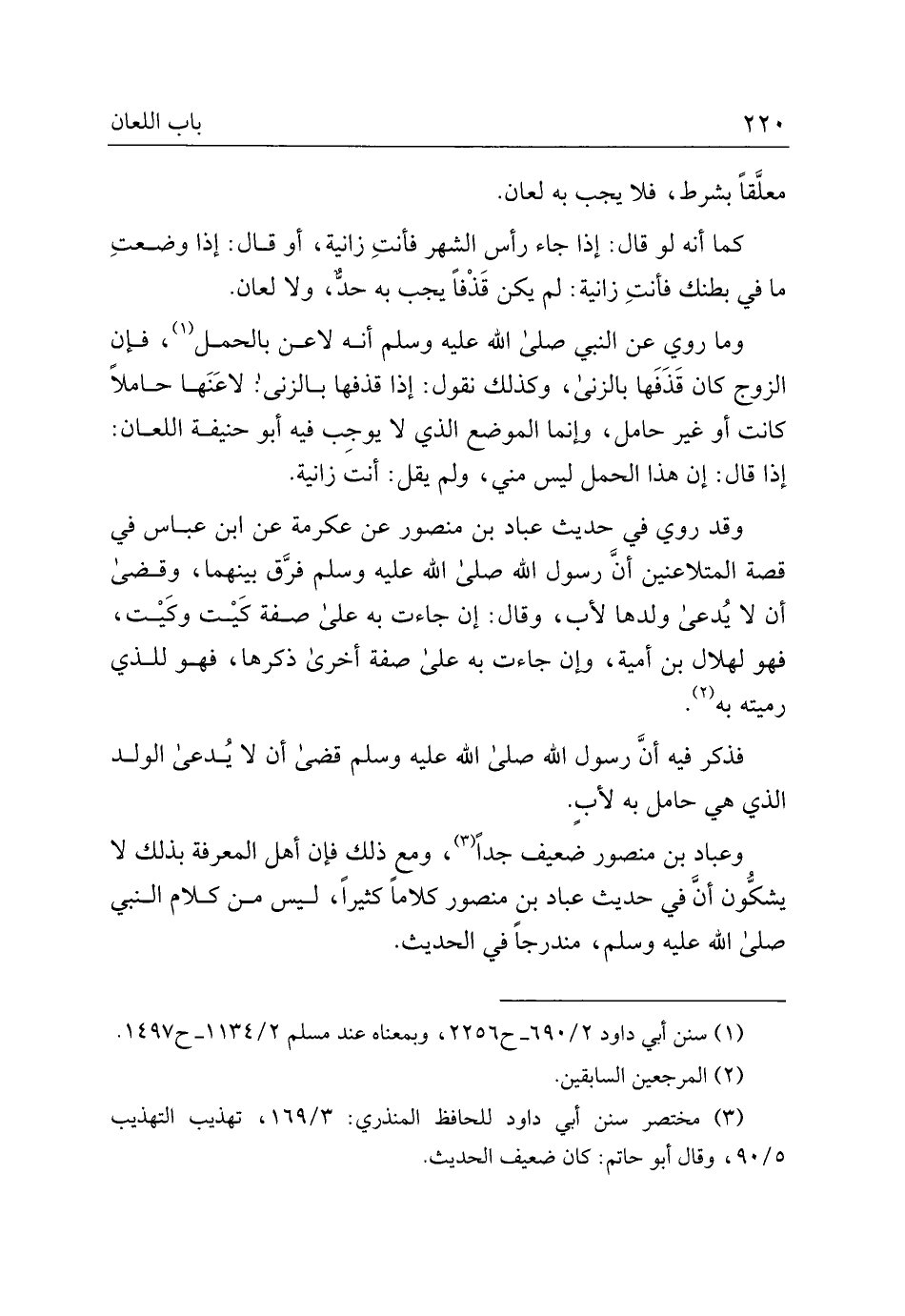 وما روي عن النبي صلى الله عليه وسلم أنه لاعن بالحمل، فإن الزوج كان قذفها بالزنى، وكذلك نقول: إذا قذفها بالزنى: لاعنها حاملًا كانت أو غير حامل، وإنما الموضع الذي لا يوجب فيه أبو حنيفة اللعان: إذا قال: إن هذا الحمل ليس مني، ولم يقل: أنت زانية.