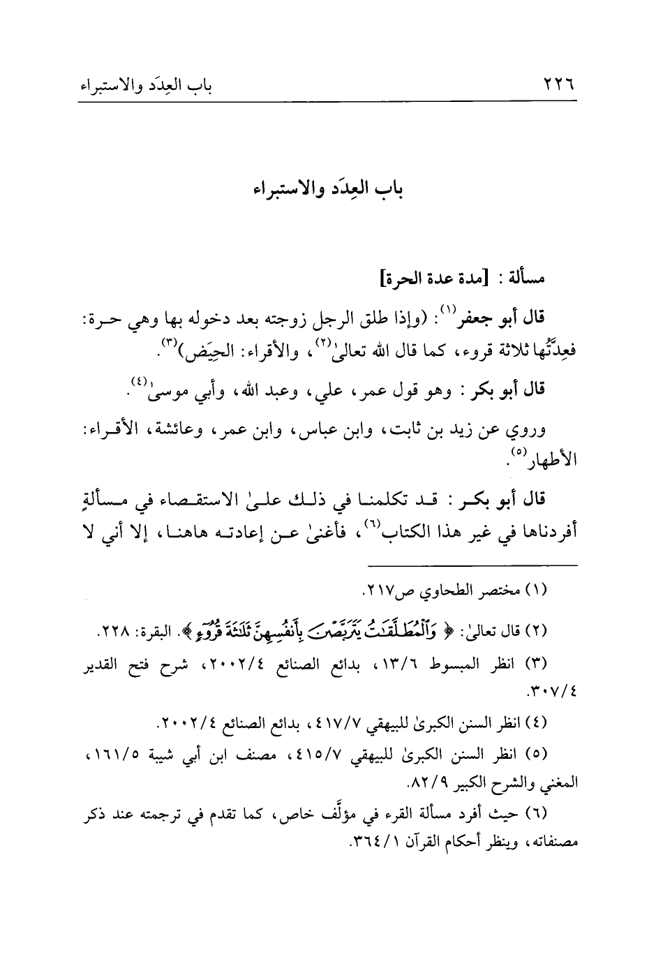 قال أبو جعفر: (وإذا طلق الرجل زوجته بعد دخوله بها وهي حرة: فعدتها ثلاثة قروء، كما قال الله تعالى، والأقراء: الحيض).
