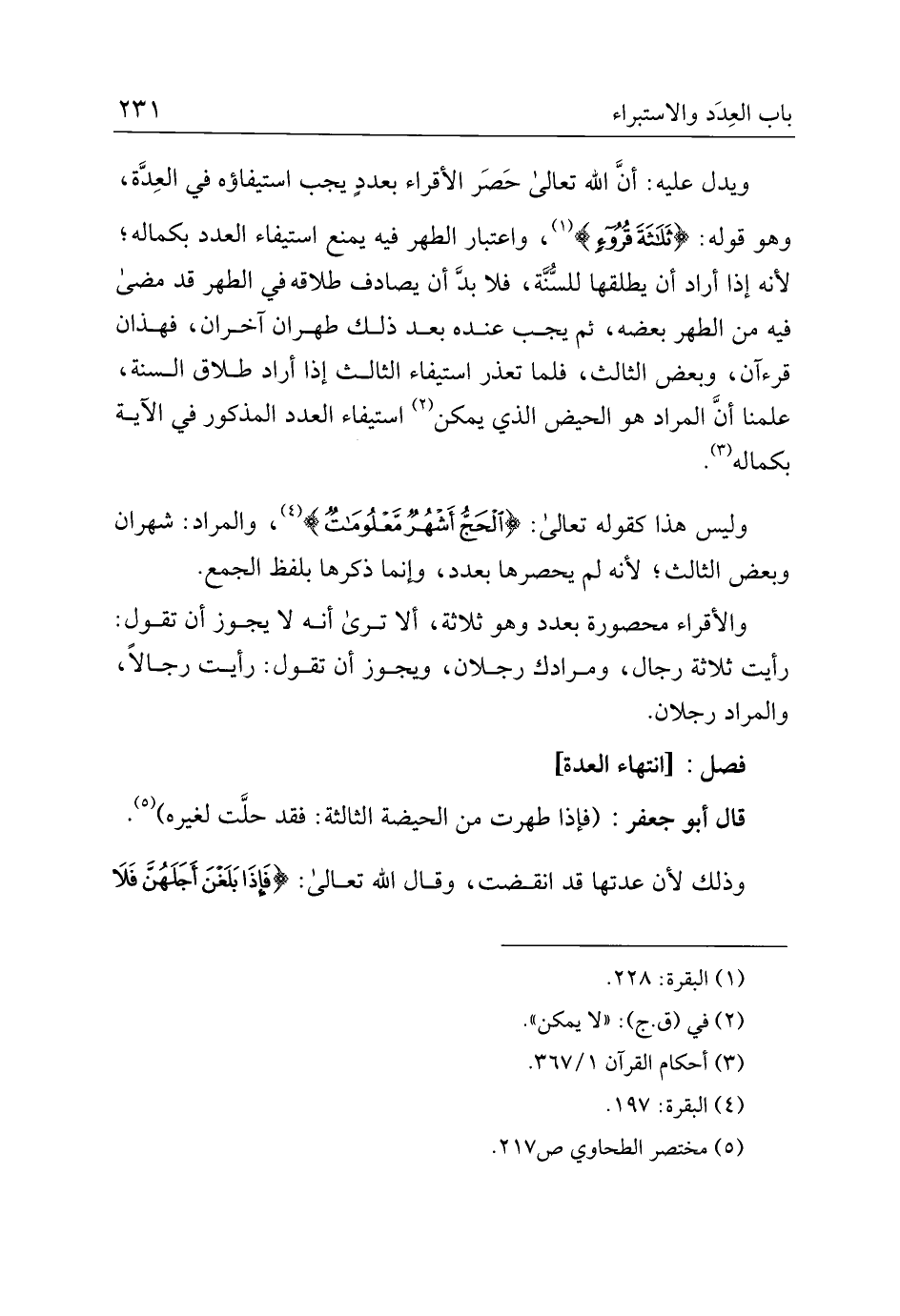 ويدل عليه: أن الله تعالى حصر الأقراء بعدد يجب استيفاؤه في العدة، وهو قوله: {ثلاثة قروء}، واعتبار الطهر فيه يمنع استيفاء العدد بكماله، لأنه إذا أراد أن يطلقها للسنة، فلا بد أن يصادف طلاقه في الطهر قد مضى فيه من الطهر بعضه، ثم يجب عنده بعد ذلك طهران آخران، فهذان قرءان، وبعض الثالث، فلما تعذر استيفاء الثالث إذا أراد طلاق السنة، علمنا أن المراد هو الحيض الذي يمكن استيفاء العدد المذكور في الآية بكماله.