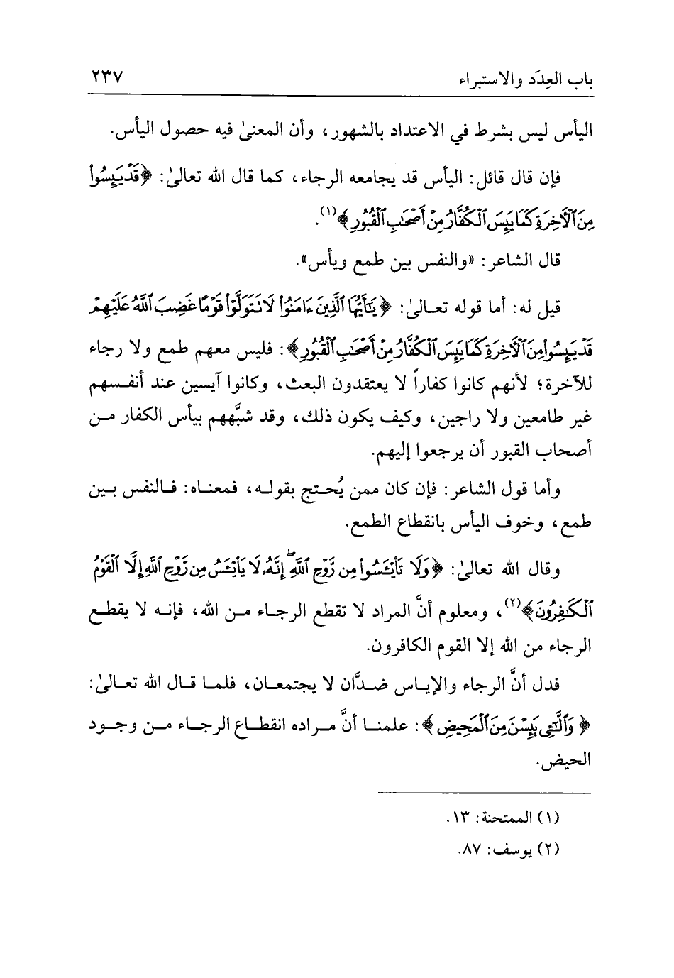 فدل أن الرجاء والإياس ضدان لا يجتمعان، فلما قال الله تعالى: {واللائي يئسن من المحيض}: علمنا أن مراده انقطاع الرجاء من وجود الحيض.