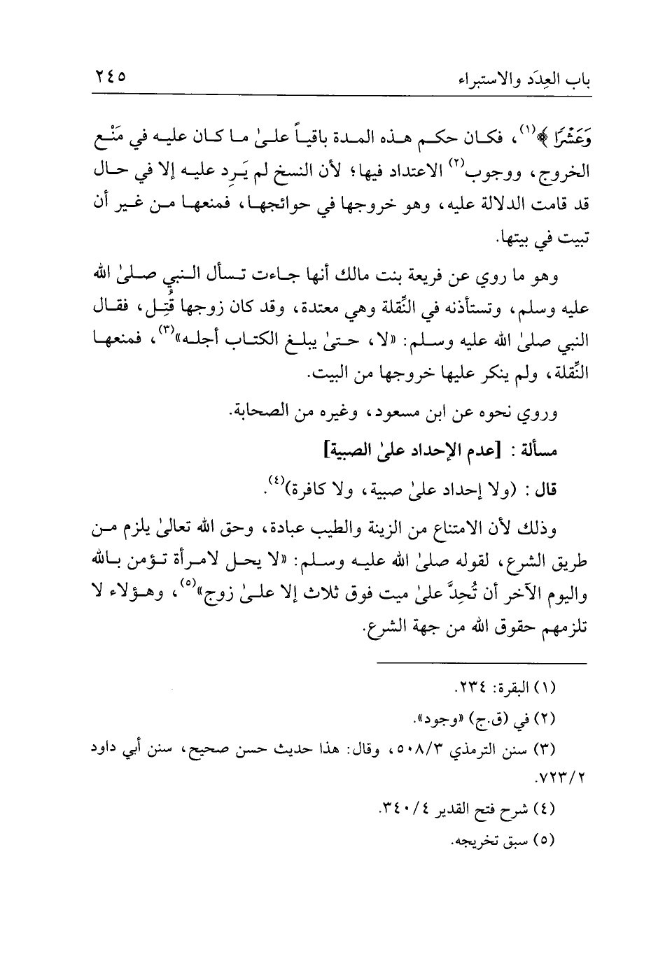 وعشرًا}، فكان حكم هذه المدة باقيًا على ما كان عليه في منع الخروج، ووجوب الاعتداد فيها؛ لأن النسخ لم يرد عليه إلا في حال قد قامت الدلالة عليه، وهو خروجها في حوائجها، فمنعها من غير أن تبيت في بيتها.