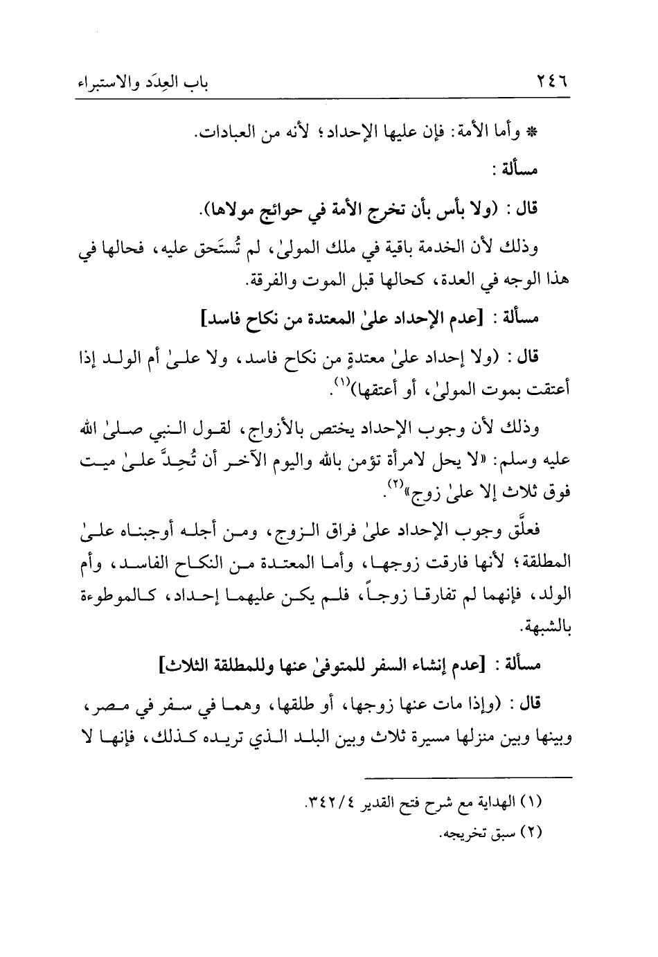مسألة: [عدم إنشاء السفر للمتوفى عنها والمطلقة الثلاث]