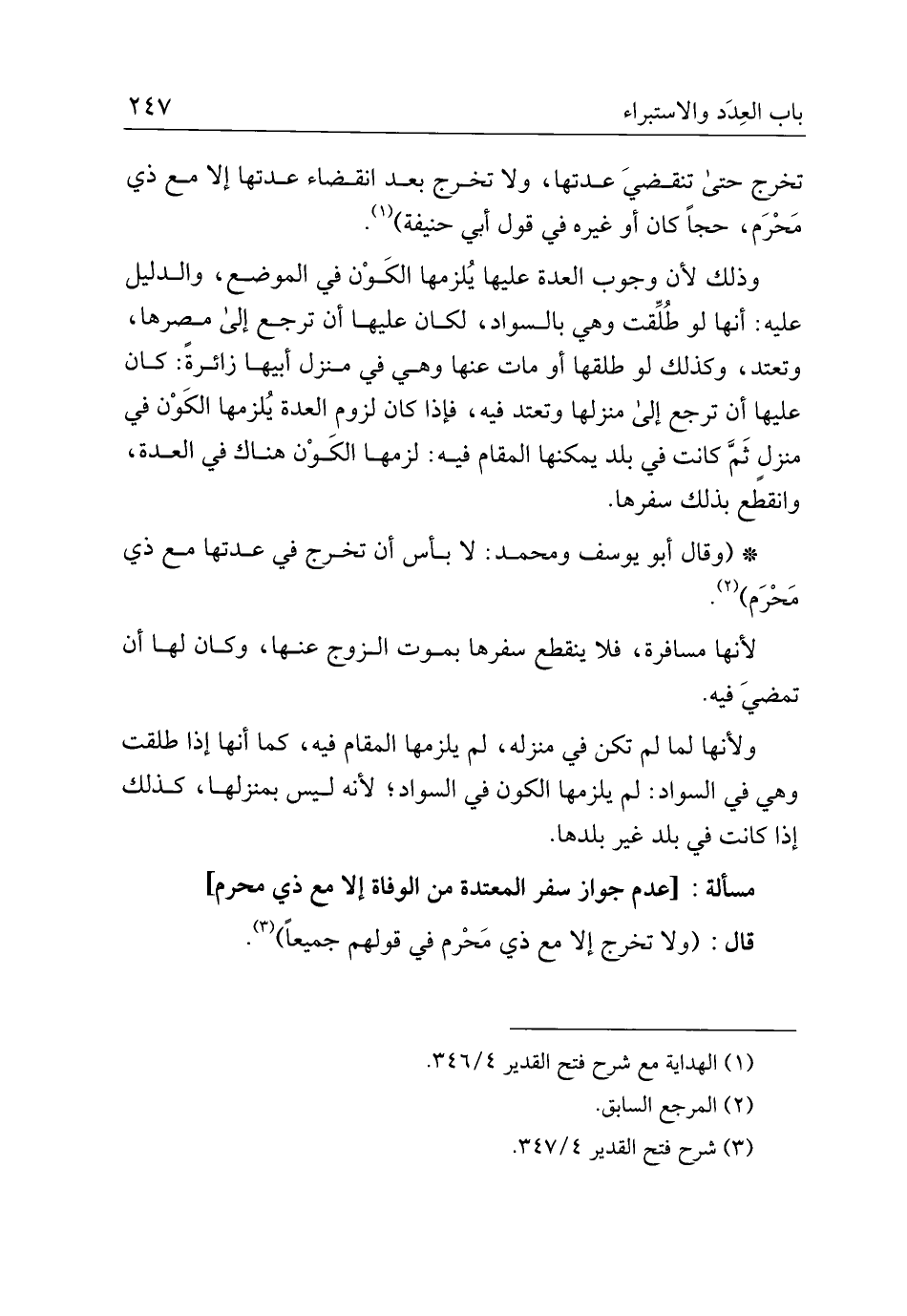 مسألة: [عدم جواز سفر المعتدة من الوفاة إلا مع ذي محرم]