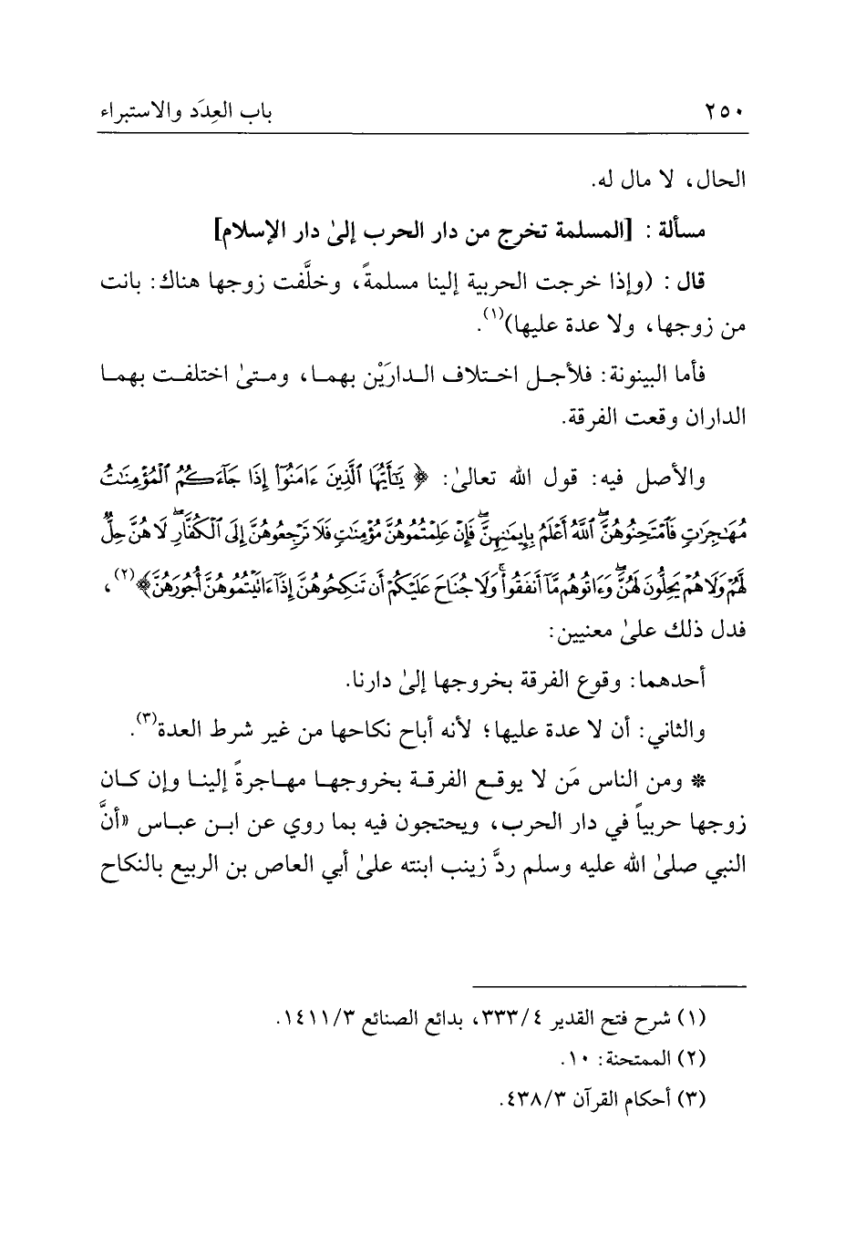 * ومن الناس من لا يوقع الفرقة بخروجها مهاجرة إلينا وإن كان زوجها حربيًا في دار الحرب، ويحتجون فيه بما روي عن ابن عباس "أن النبي صلى الله عليه وسلم رد زينب ابنته على أبي العاص بن الربيع بالنكاح