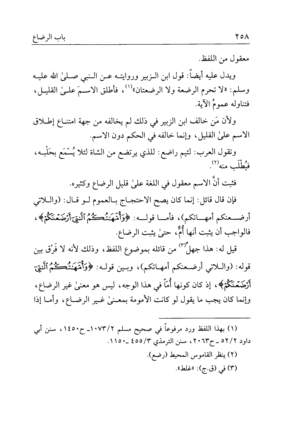 ويدل عليه أيضًا: قول ابن الزبير وروايته عن النبي صلى الله عليه وسلم: "لا تحرم الرضعة ولا الرضعتان"، فأطلق الاسم على القليل، فتناوله عموم الآية.