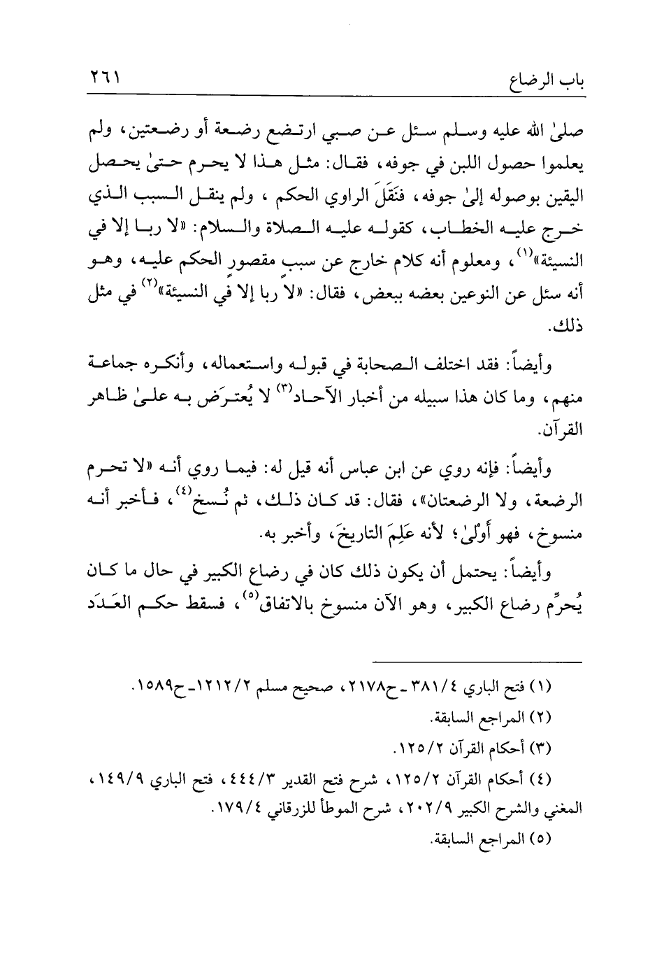 صلى الله عليه وسلم سئل عن صبي ارتضع رضعة أو رضعتين، ولم يعلموا حصول اللبن في جوفه، فقال: مثل هذا لا يحرم حتى يحصل اليقين بوصوله إلى جوفه، فنقل الراوي الحكم، ولم ينقل السبب الذي خرج عليه الخطاب، كقوله عليه الصلاة والسلام: "لا ربا إلا في النسيئة"، ومعلوم أنه كلام خارج عن سبب مقصور الحكم عليه، وهو أنه سئل عن النوعين بعضه ببعض، فقال: "لا ربا إلا في النسيئة" في مثل ذلك.