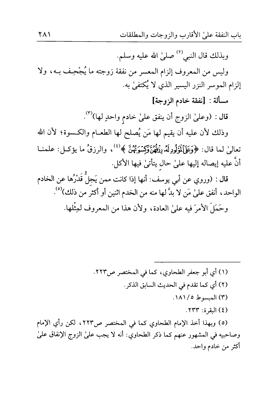 قال: (وروي عن أبي يوسف: أنها إذا كانت ممن يجل قدرها عن الخادم الواحد، أنفق على من لا بد لها منه من الخدم اثنين أو أكثر من ذلك).