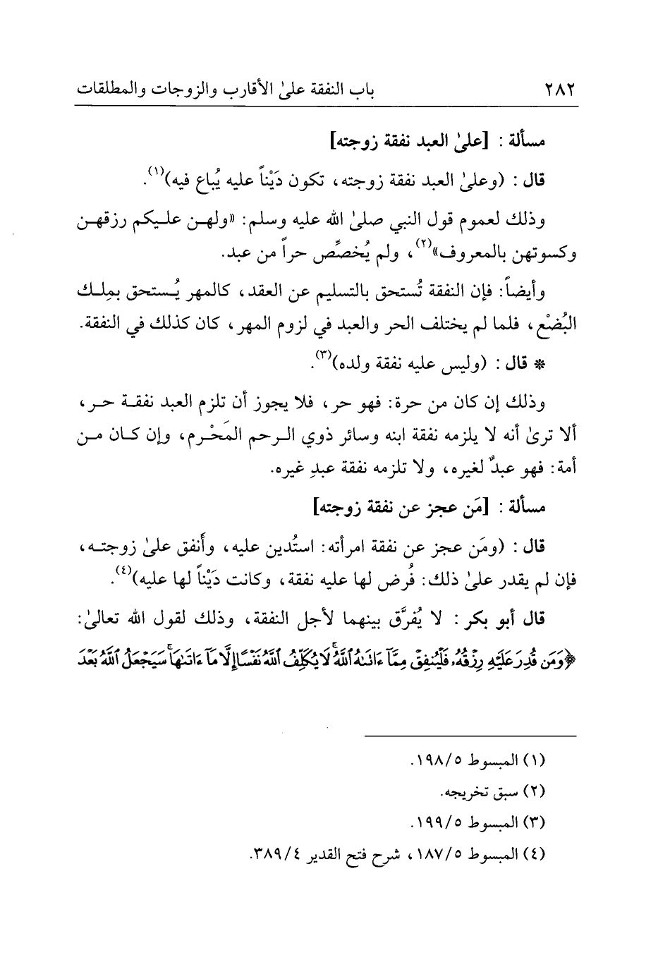 وأيضًا: فإن النفقة تستحق بالتسليم عن العقد، كالمهر يستحق بملك البضع، فلما لم يختلف الحر والعبد في لزوم المهر، كان كذلك في النفقة.