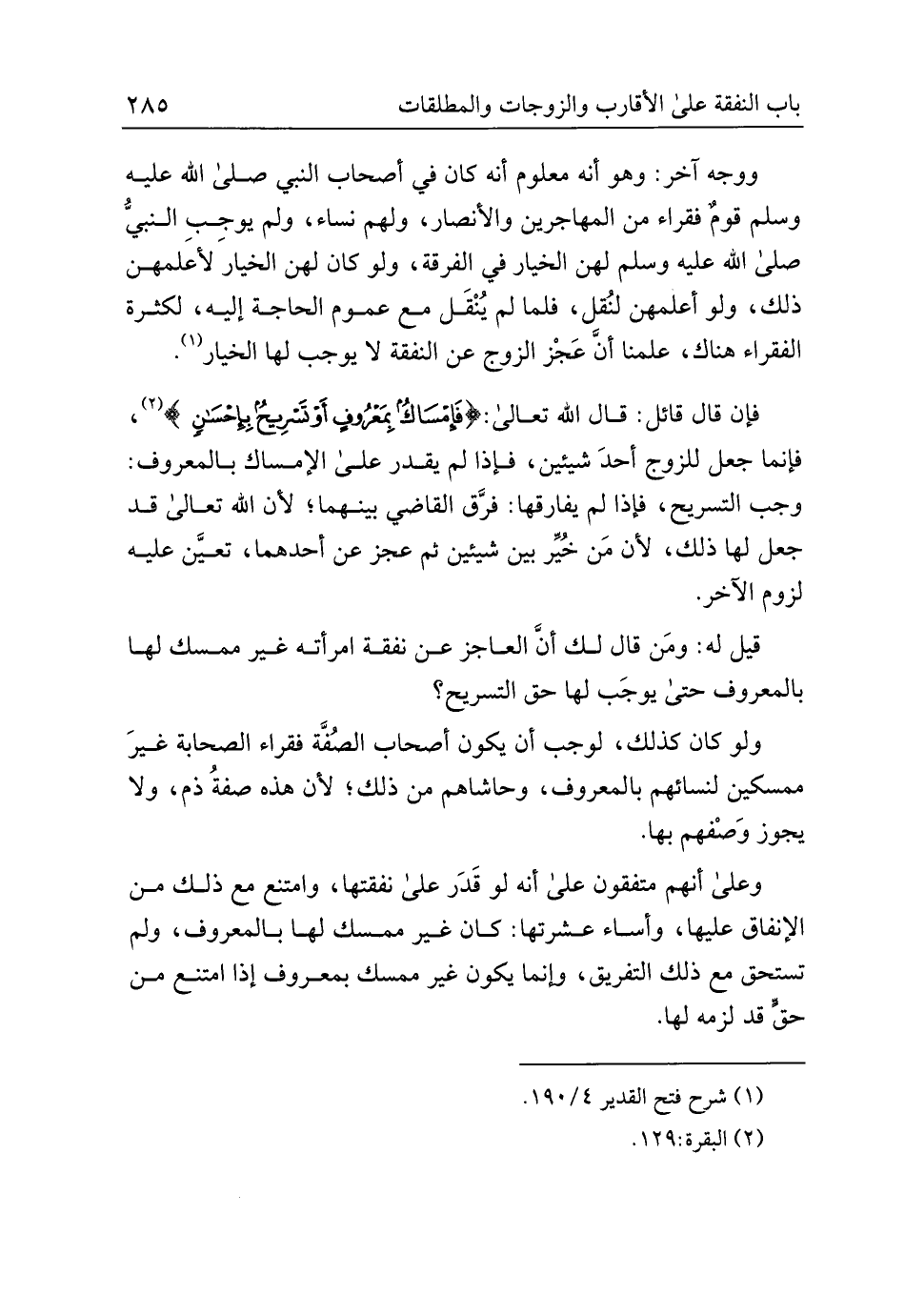 ولو كان ذلك، لوجب أن يكون أصحاب الصفة فقراء الصحابة غير ممسكين لنسائهم بالمعروف، وحاشاهم من ذلك؛ لأن هذه صفة ذم، ولا يجوز وصفهم بها.