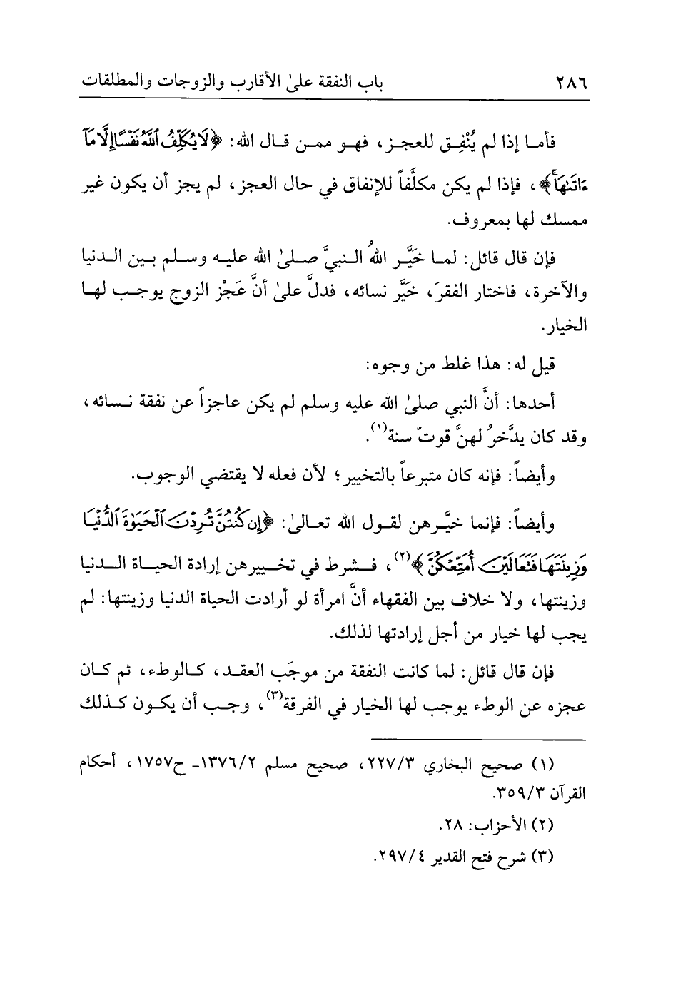 فإن قال قائل: لما خير الله النبي صلى الله عليه وسلم بين الدنيا والآخرة، فاختار الفقر، خير نسائه، فدل على أن عجز الزوج يوجب لها الخيار.