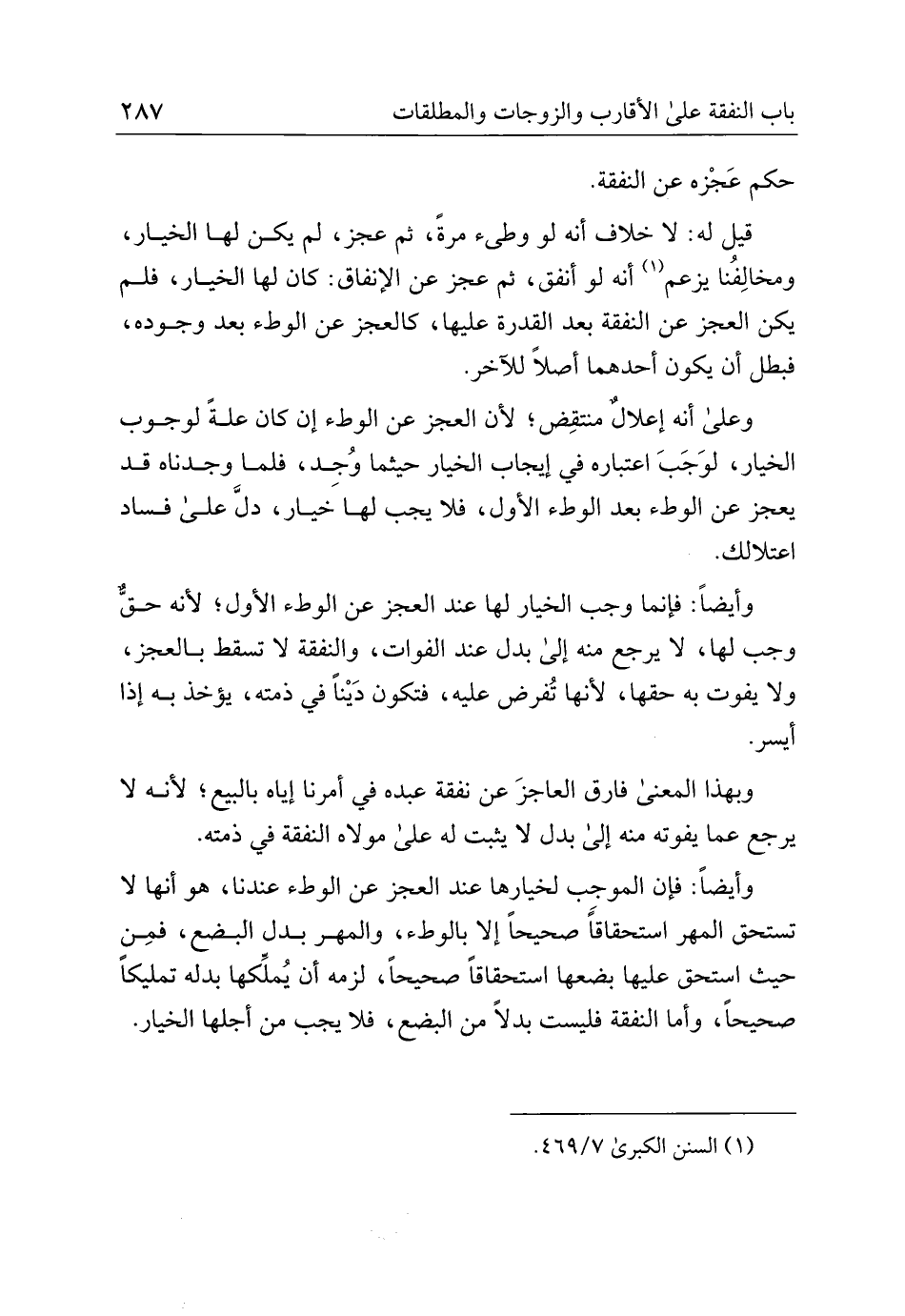 وأيضًا: فإن الموجب لخيارها عند العجز عن الوطء عندنا، هو أنها لا نستحق المهر استحقاقًا صحيحًا إلا بالوطء، والمهر بدل البضع، فمن حيث استحق عليها بضعها استحقاقًا صحيحًا، لزمه أن يملكها بدله تمليكًا صحيحًا، وأما النفقة فليست بدلًا من البضع، فلا يجب من أجلها الخيار.