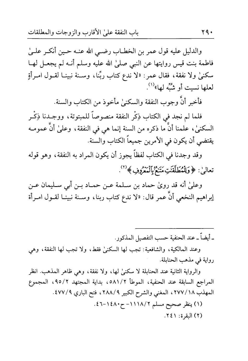 فأخبر أن وجوب النفقة والسكنى مأخوذ من الكتاب والسنة.