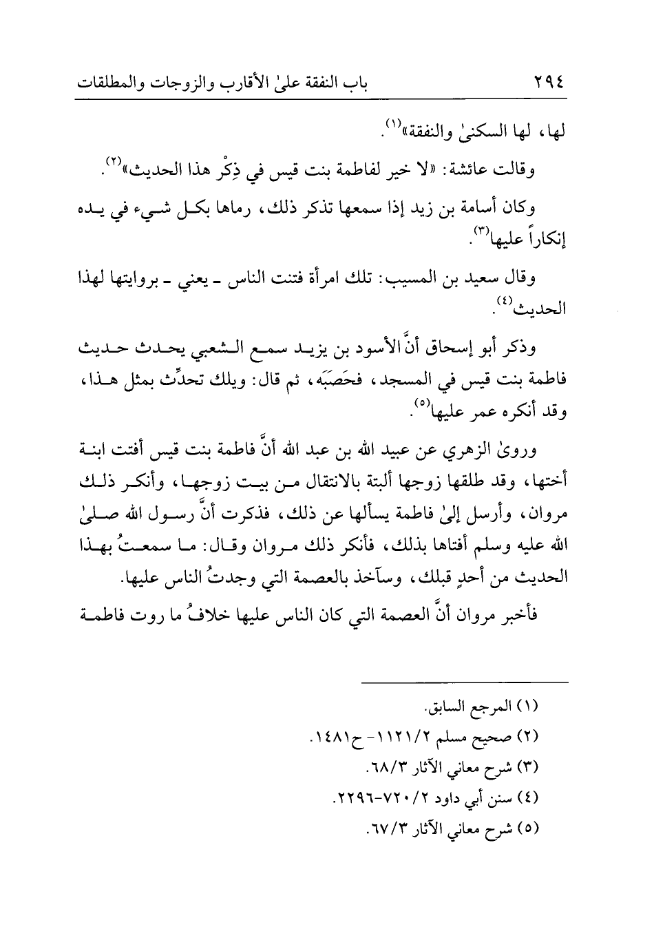 وروى الزهري عن عبيد الله بن عبد الله أن فاطمة بنت قيس أفتت ابنة أختها، وقد طلقها زوجها ألبتة بالانتقال من بيت زوجها، وأنكر ذلك مروان، وأرسل إلى فاطمة يسألها عن ذلك، فذكرت أن رسول الله صلى الله عليه وسلم أفتاها بذلك، فأنكر ذلك مروان وقال: ما سمعت بهذا الحديث من أحد قبلك، وسآخذ بالعصمة التي وجدت الناس عليها فأخبر مروان أن العصمة التي كان الناس عليها خلاف ما روت فاطمة