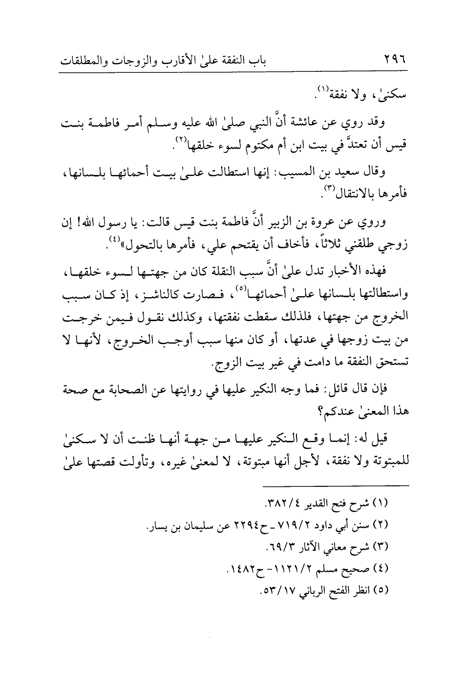 فهذه الأخبار تدل على أن سبب النقلة كان من جهتها لسوء خلقها، واستطالتها بلسانها على أحمائها، فصارت كالناشز، إذ كان سبب الخروج من جهتها، فلذلك سقطت نفقتها، وكذلك نقول فيمن خرجت من بيت زوجها في عدتها، أو كان منها سبب أوجب الخروج، لأنها لا تستحق النفقة ما دامت في غير بيت الزوج.