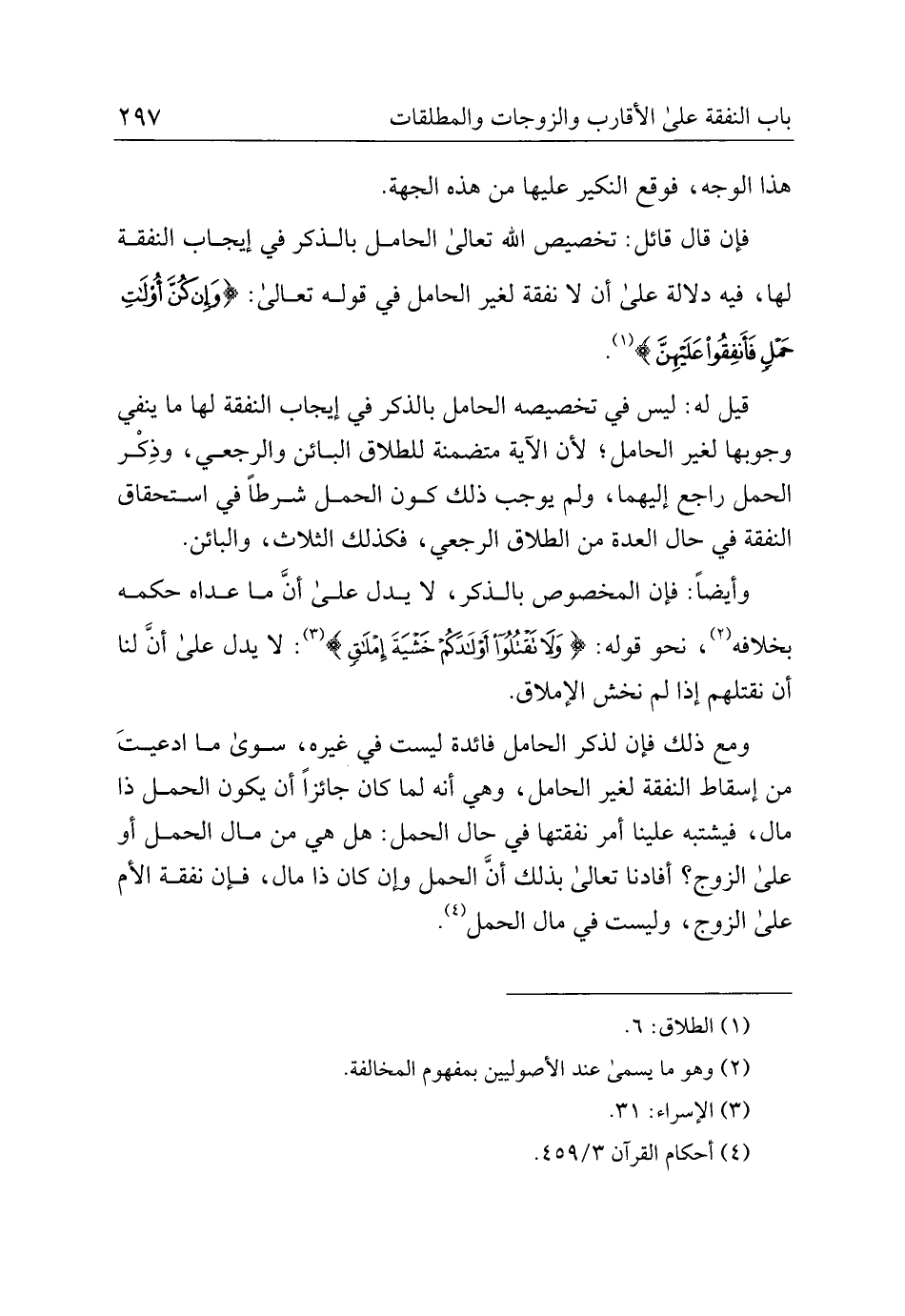 فإن قال قائل: تخصيص الله تعالى الحامل بالذكر في إيجاب النفقة لها، فيه دلالة على أن لا نفقة لغير الحامل في قوله تعالى: {وإن كن أولات حمل فأنفقوا عليهن}.