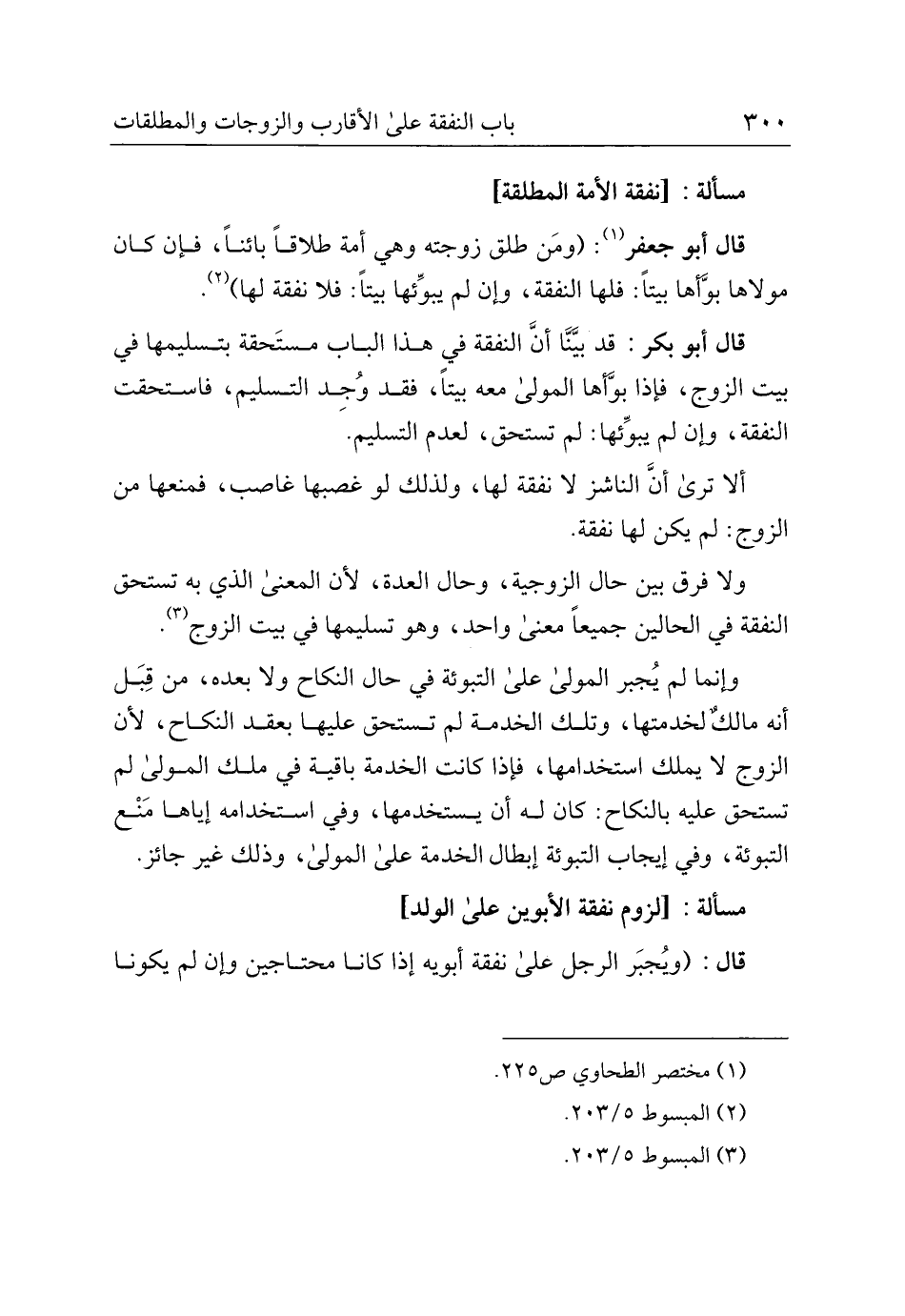 قال أبو جعفر: (ومن طلق زوجته وهي أمة طلاقًا بائنًا، فإن كان مولاها بوأها بيتًا: فلها النفقة، وإن لم يبوئها بيتًا: فلا نفقة لها).