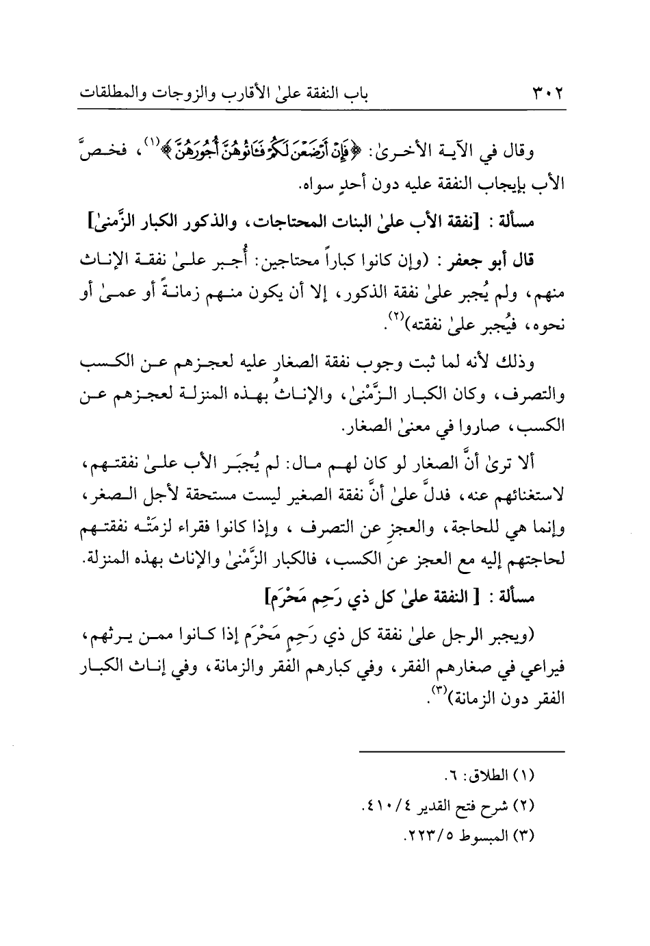 قال أبو جعفر: (وإن كانوا كبارًا محتاجين: أجبر على نفقة الإناث منهم، ولم يجبر على نفقة الذكور، إلا أن يكون منهم زمانة أو عمى أو نحوه، فيجبر على نفقته).