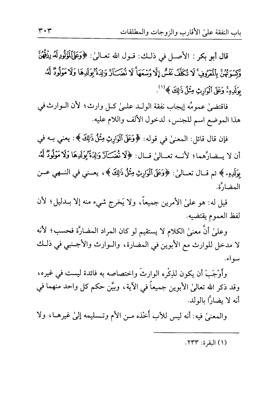قال أبو بكر: الأصل في ذلك: قول الله تعالى: {وعلى المولود له رزقهن وكسوتهن بالمعروف لا تكلف نفس إلا وسعها لا تضار والدة بولدها ولا مولود له بولده وعلى الوارث مثل ذلك}.