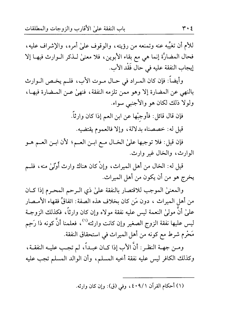 ومن جهة النظر: أن الأب إذا كان عبدًا، لم تجب عليه النفقة، وكذلك الكافر ليس عليه نفقة أخيه المسلم، وأن الوالد المسلم تجب عليه
