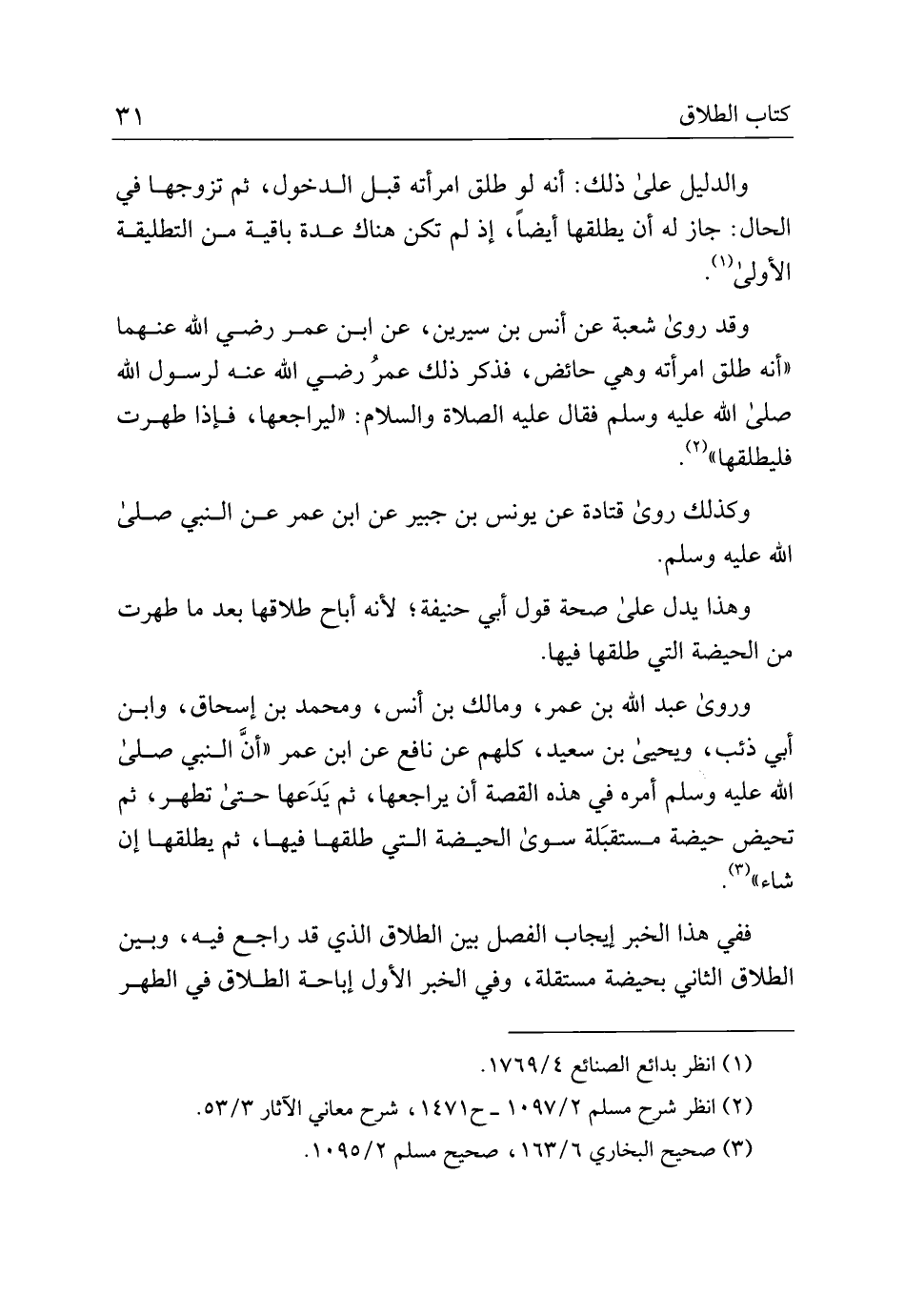 وقد روى شعبة عن أنس بن سيرين، عن ابن عمر رضي الله عنهما "أنه طلق امرأته وهي حائض، فذكر ذلك عمر رضي الله عنه لرسول الله صلى الله عليه وسلم فقال عليه الصلاة والسلام: "ليراجعها، فإذا طهرت فليطلقها".