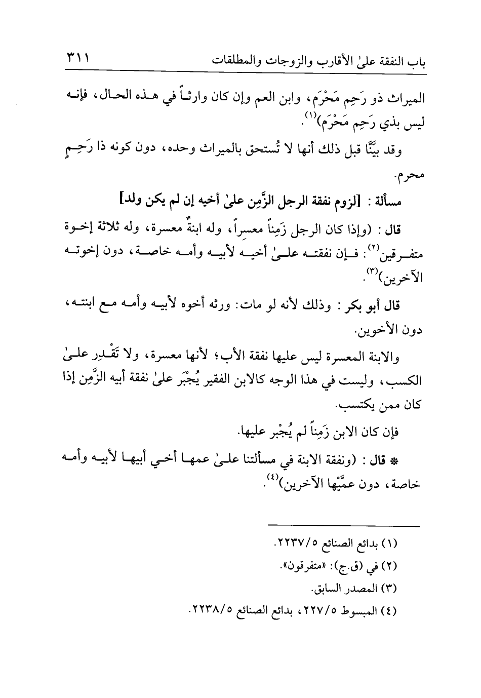 قال: (وإذا كان الرجل زمنًا معسرًا، وله ابنه معسرة، وله ثلاثة إخوة متفرقين: فإن نفقته على أخيه لأبيه وأمه خاصة، دون إخوته الآخرين".