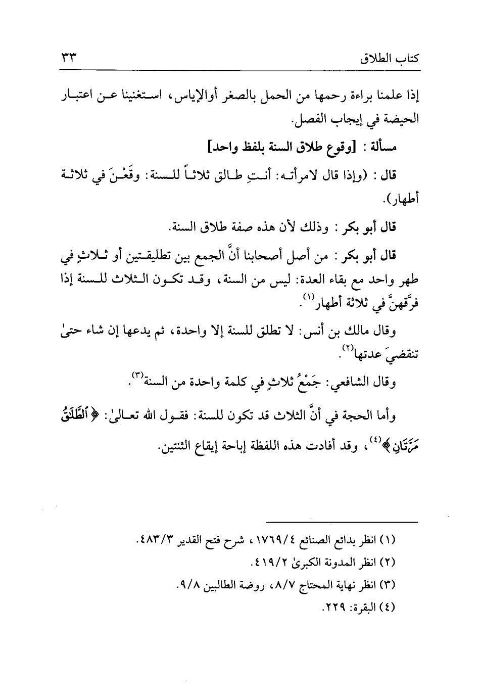 وأما الحجة في أن الثلاث قد تكون للسنة: فقول الله تعالى: {الطلاق مرتان}، وقد أفادت هذه اللفظة إباحة إيقاع الثنتين.