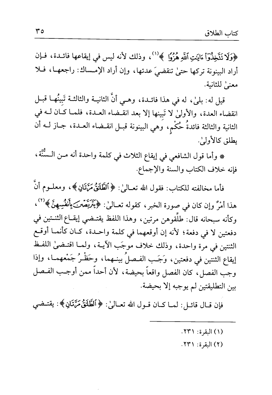 * وأما قول الشافعي في إيقاع الثلاث في كلمة واحدة أنه من السنة، فإنه خلاف الكتاب والسنة والإجماع.