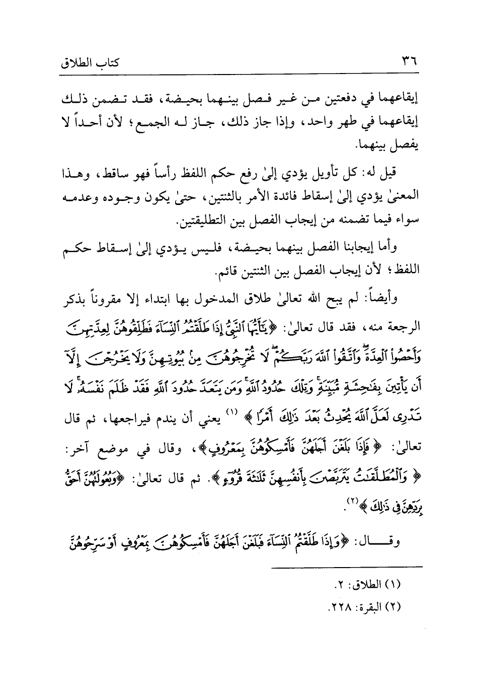 وأيضًا: لم يبح الله تعالى طلاق المدخول بها ابتداء إلا مقرونًا بذكر الرجعة منه، فقد قال تعالى: {يا أيها النبي إذا طلقتم النساء فطلقوهن لعدتهن وأحصوا العدة واتقوا الله ربكم لا تخرجوهن من بيوتهن ولا يخرجن إلا أن يأتين بفحشة مبينة وتلك حدود الله ومن يتعد حدود الله فقد ظلم نفسه لا تدرى لعل الله يحدث بعد ذلك أمرًا} يعني أن يندم فيراجعها، ثم قال تعالى: {فإذا بلغن أجلهن فأمسكوهن بمعروف}، وقال في موضع آخر: {والمطلقات يتربصن بأنفسهن ثلاثة قروء}. ثم قال تعالى: {وبعولتهن أحق بردهن في ذلك}.