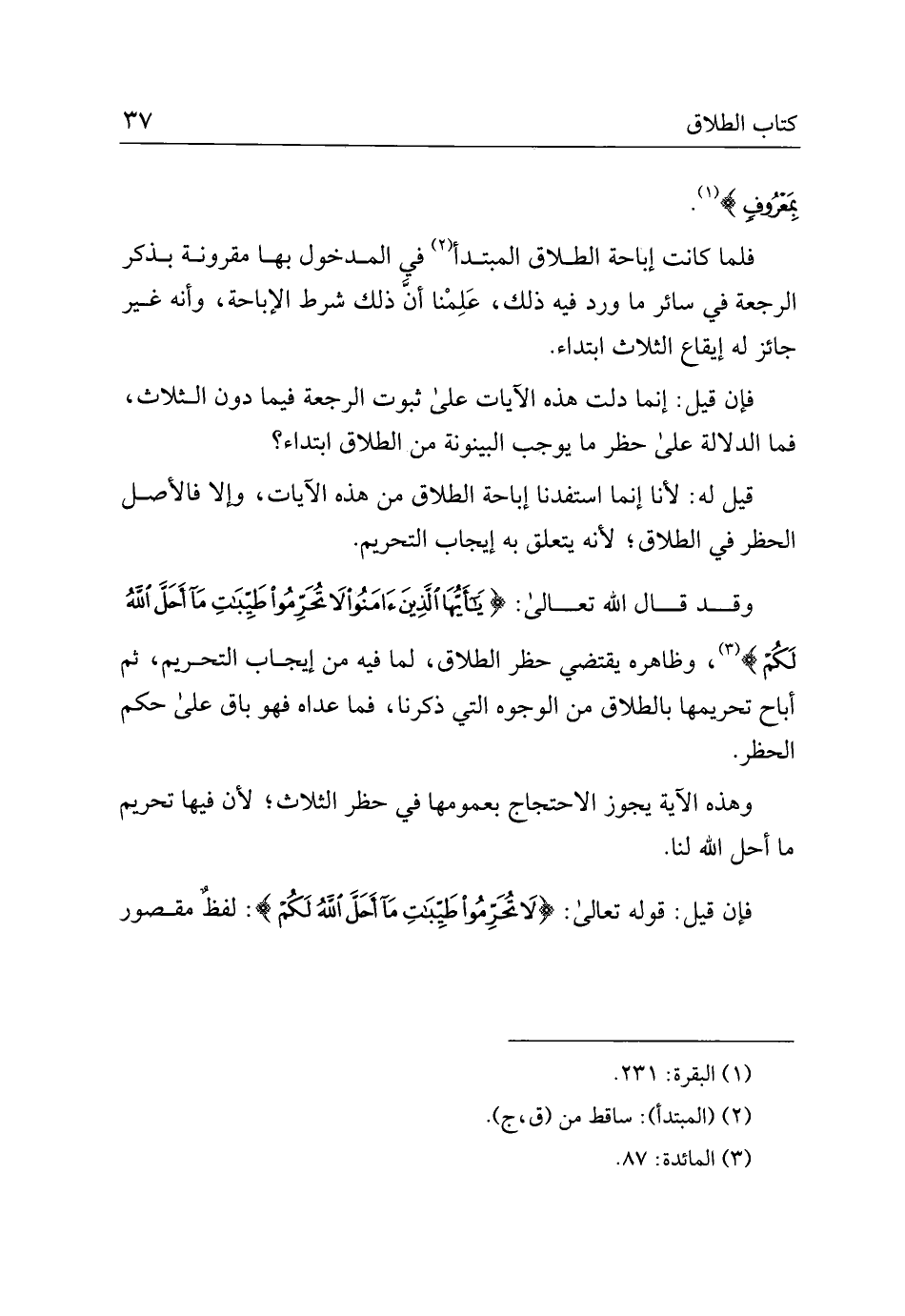 قيل له: لأنا إنما استفدنا إباحة الطلاق من هذه الآيات، وإلا فالأصل الحظر في الطلاق؛ لأنه يتعلق به إيجاب التحريم.