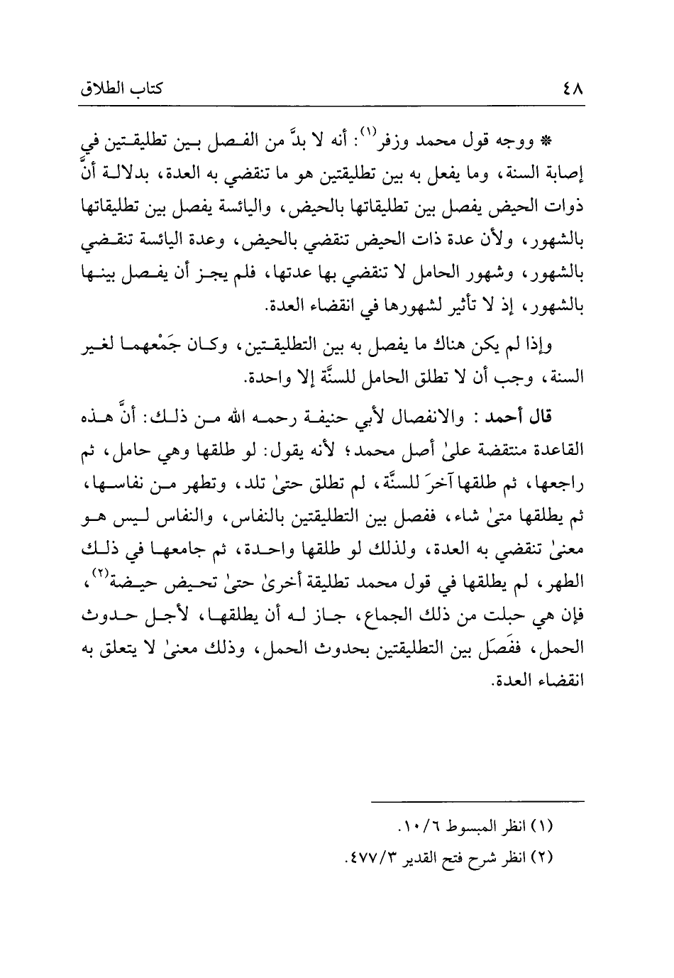 * ووجه قول محمد وزفر: أنه لابد من الفصل بين تطليقتين في إصابة السنة، وما يفعل به بين تطليقتين هو ما تنقضي به العدة، بدلالة أن ذوات الحيض يفصل بين تطليقاتها بالحيض، واليائسة يفصل بين تطليقاتها بالشهور، ولأن عدة ذات الحيض تنقضي بالحيض، وعدة اليائسة تنقضي بالشهور، وشهور الحامل لا تنقضي بها عدتها، فلم يجز أن يفصل بينها بالشهور، إذ لا تأثير لشهورها في انقضاء العدة.