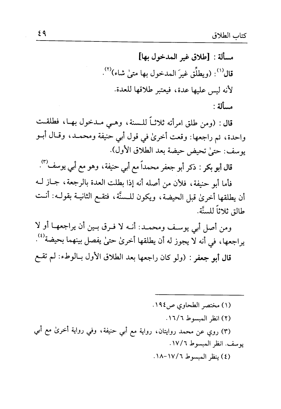 ومن أصل يوسف ومحمد: أنه لا فرق بين أن يراجعها أو لا يراجعها، في أنه لا يجوز له أن يطلقها أخرى حتى يفصل بينهما بحيضة.