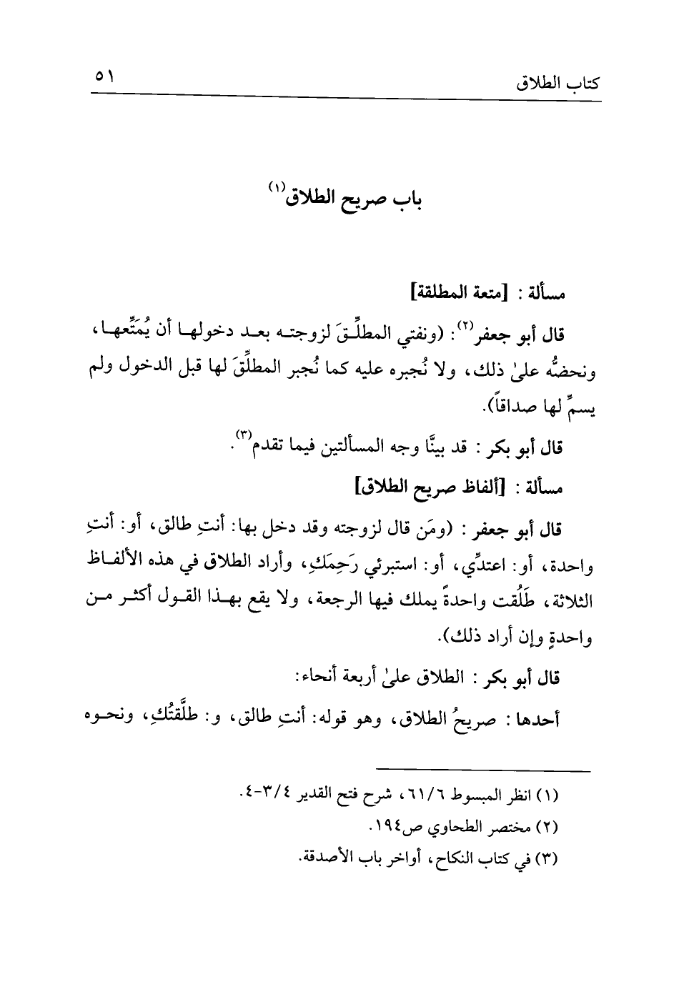 قال أبو جعفر: (ومن قال لزوجته وقد دخل بها: أنت طالق، أو: أنت واحدة، أو: اعتدي، أو: استبرئي رحمك، وأراد الطلاق في هذه الألفاظ الثلاثة، طلقت واحدة يملك فيها الرجعة، ولا يقع بهذا القول أكثر من واحدة وإن أراد ذلك".