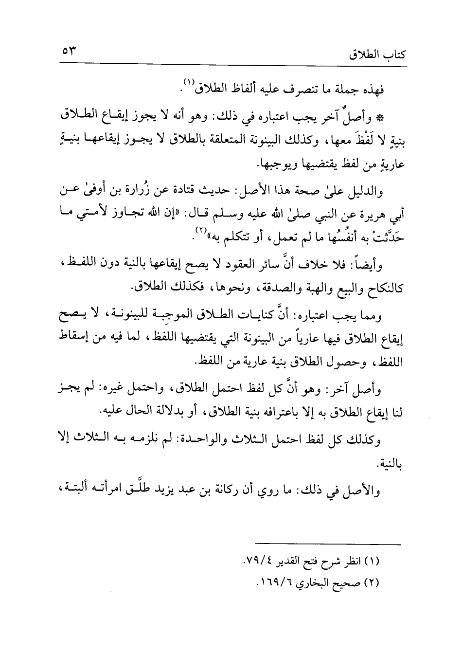 ومما يجب اعتباره: أن كنايات الطلاق الموجبة للبينونة، لا يصح إيقاع الطلاق فيها عاريًا من البينونة التي يقتضيها اللفظ، لما فيه من إسقاط اللفظ، وحصول الطلاق بنية عارية من اللفظ.