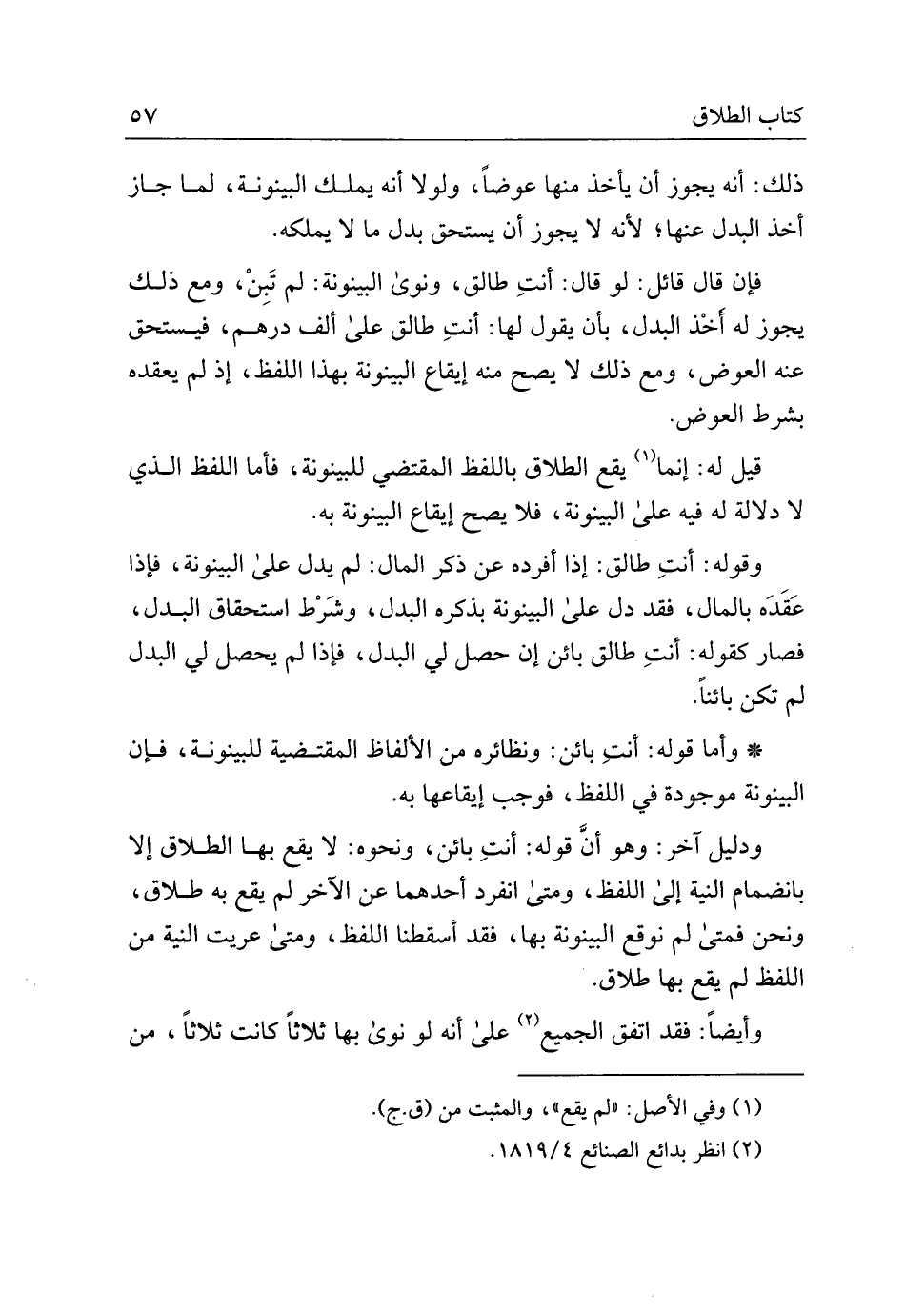 ودليل آخر: وهو أن قوله: أنت بائن، ونحوه: لا يقع بها الطلاق إلا بانضمام النية إلى اللفظ، ومتى انفرد أحدهما عن الآخر لم يقع به طلاق، ونحن فمتى لم نوقع البينونة بها، فقد أسقطنا اللفظ، ومتى عريت النية من اللفظ لم يقع بها طلاق.