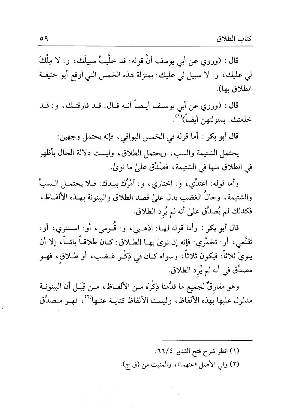 قال: (وروي عن أبي يوسف أن قوله: قد خليت سبيلك، و: لا ملك لي عليك، و: لا سبيل لي عليك: بمنزلة هذه الخمس التي أوقع أبو حنيفة الطلاق بها).