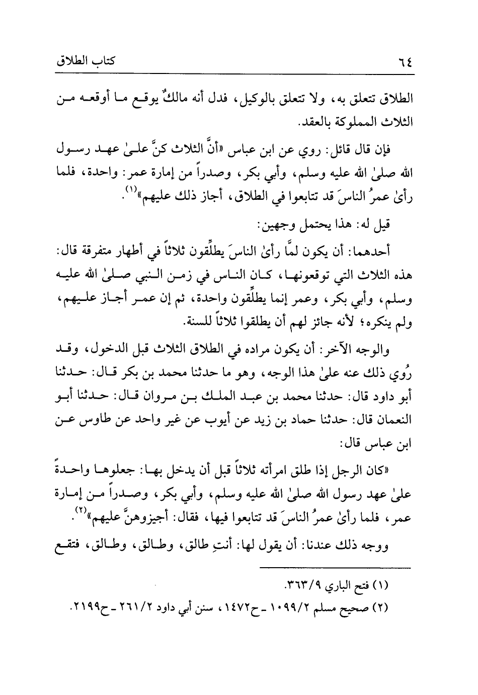 والوجه الآخر: أن يكون مراده في الطلاق الثلاث قبل الدخول، وقد روي ذلك عنه على هذا الوجه، وهو ما حدثنا محمد بن بكر قال: حدثنا أبو داود قال: حدثنا محمد بن عبد الملك بن مروان قال: حدثنا أبو النعمان قال: حدثنا حماد بن زيد عن أيوب عن غير واحد عن طاوس عن ابن عباس قال: