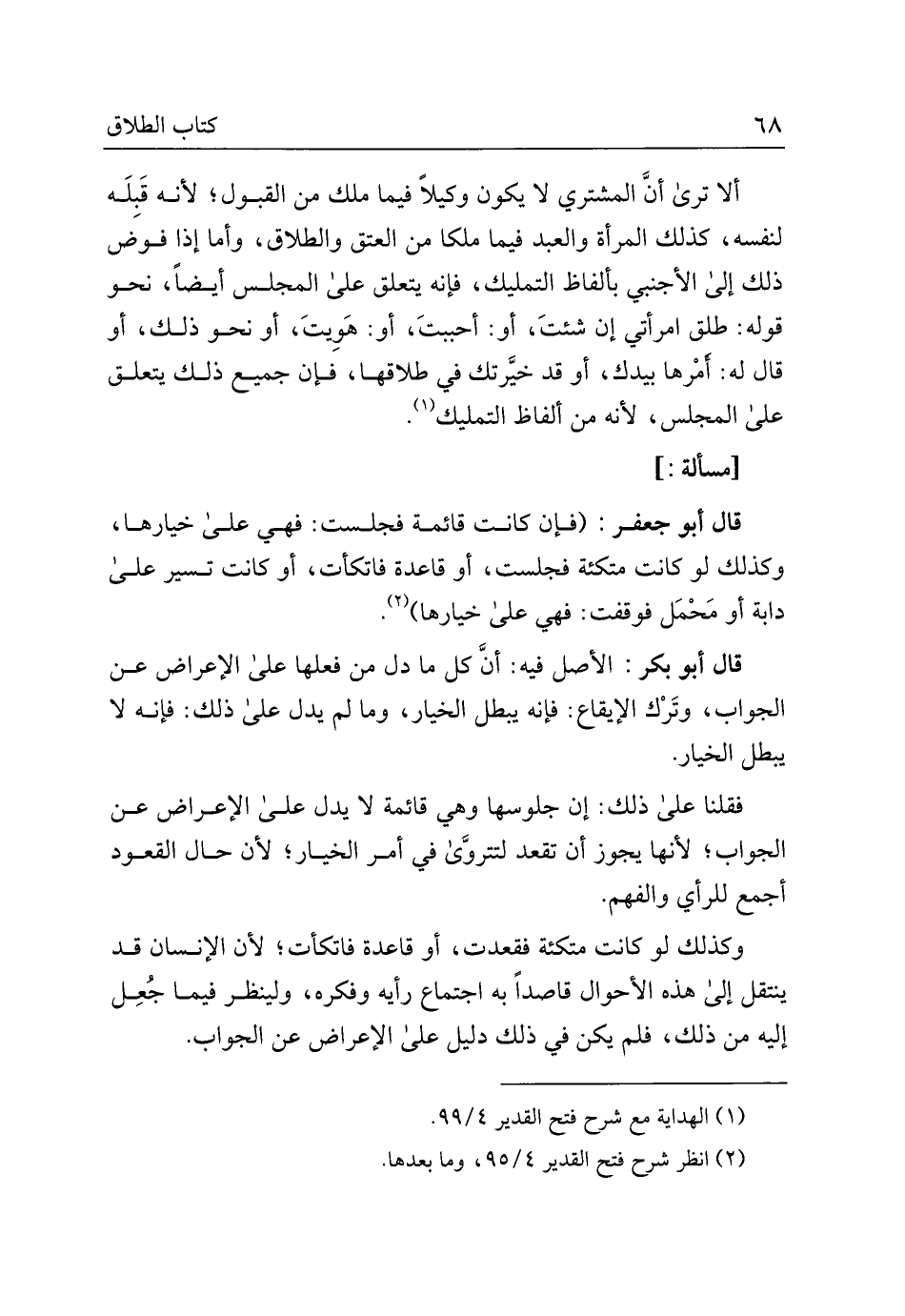ألا ترى أن المشتري لا يكون وكيلًا فيما ملك من القبول؛ لأنه قبله لنفسه، كذلك المرأة والعبد فيما ملكا من العتق والطلاق، وأما إذا فوض ذلك إلى الأجنبي بألفاظ التمليك، فإنه يتعلق على المجلس أيضًا، نحو قوله: طلق امرأتي إن شئت، أو: أحببت، أو: هويت، أو نحو ذلك، أو قال له: أمرها بيدك، أو قد خيرتك في طلاقها، فإن جميع ذلك يتعلق على المجلس، لأنه من ألفاظ التمليك.