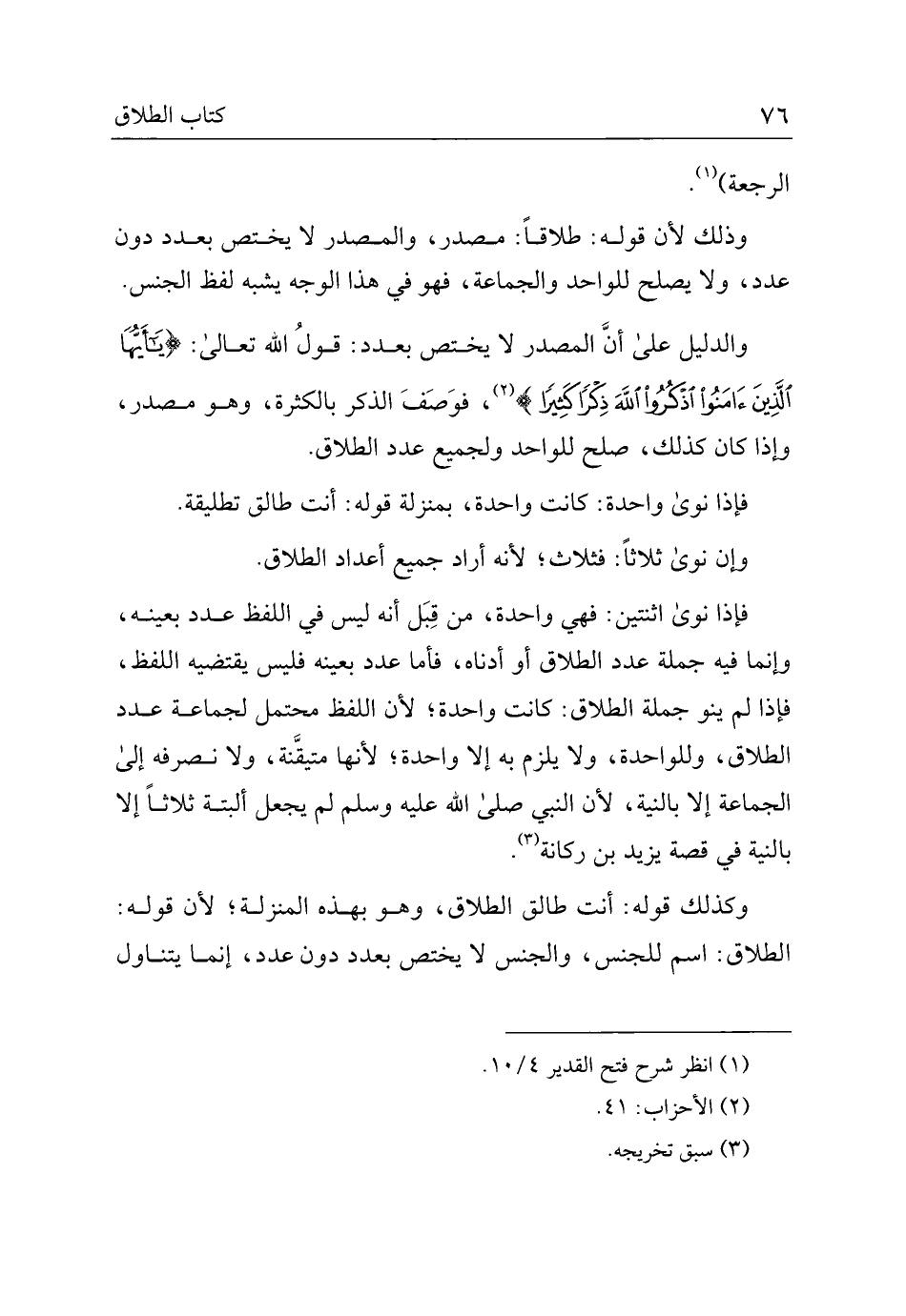وذلك لأن قوله: طلاقًا: مصدر، والمصدر لا يختص بعدد دون عدد، ولا يصلح للواحد والجماعة، فهو في هذا الوجه يشبه لفظ الجنس والدليل على أن المصدر لا يختص بعدد: قول الله تعالى: {يا أيها الذين آمنوا اذكروا الله ذكرًا كثيرًا}، فوصف الذكر بالكثرة، وهو مصدر، وإذا كان كذلك، صلح للواحد ولجميع عدد الطلاق.