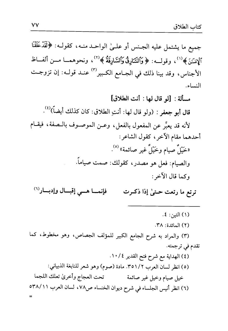 قال أبو جعفر: (ولو قال لها: أنت الطلاق: كان كذلك أيضًا".