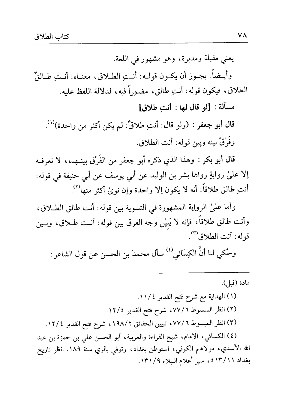 قال أبو بكر: وهذا الذي ذكره أبو جعفر من الفرق بينهما، لا نعرفه إلا على رواية رواها بشر بن الوليد عن أبي يوسف عن أبي حنيفة في قوله: أنت طالق طلاقًا: أنه لا يكون إلا واحدة وإن نوى أكثر منها.