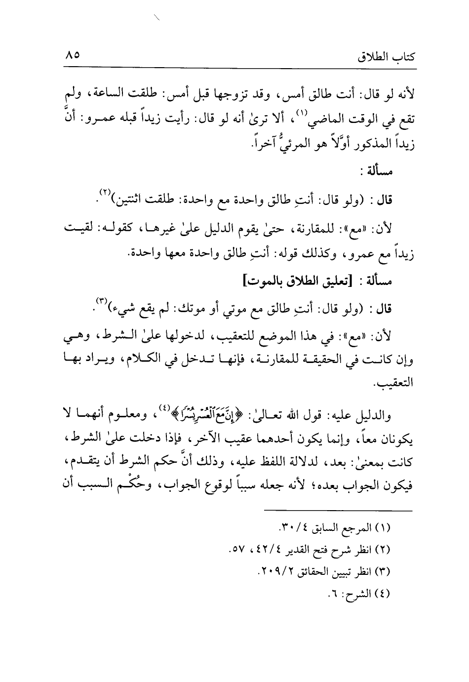 والدليل عليه: قول الله تعالى: {إن مع العسر يسرًا}، ومعلوم أنهما لا يكونان معًا، وإنما يكون أحدهما عقيب الآخر، فإذا دخلت على الشرط، كانت بمعنى: بعد، لدلالة اللفظ عليه، وذلك أن حكم الشرط أن يتقدم، فيكون الجواب بعده؛ لأنه جعله سببًا لوقوع الجواب، وحكم السبب أن