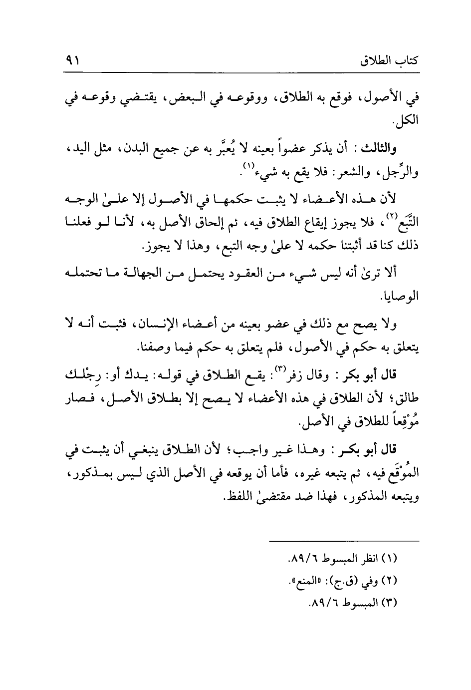 قال أبو بكر: وقال زفر: يقع الطلاق في قوله: يدك أو: رجلك طالق؛ لأن الطلاق في هذه الأعضاء لا يصح إلا بطلاق الأصل، فصار موقعا للطلاق في الأصل.
