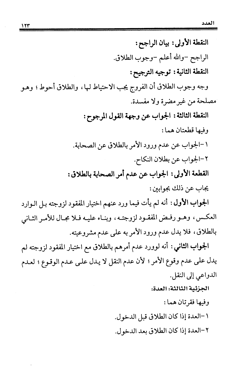 الجواب الأول: أنه لم يأت فيما ورد عنهم اختيار المفقود لزوجته بل الوارد العكس، وهو رفض المفقود لزوجته، وبناء عليه فلا مجال للأمر الثاني بالطلاق، فلا يدل عدم ورود الأمر به على عدم مشروعيته.