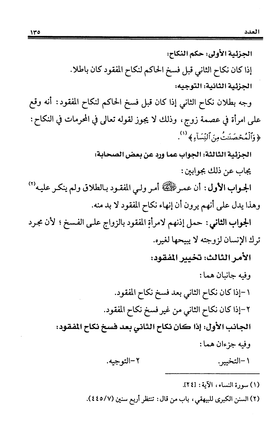 (¬2) السنن الكبرى للبيهقي، باب من قال: تنتظر أربع سنين (7/ 445).