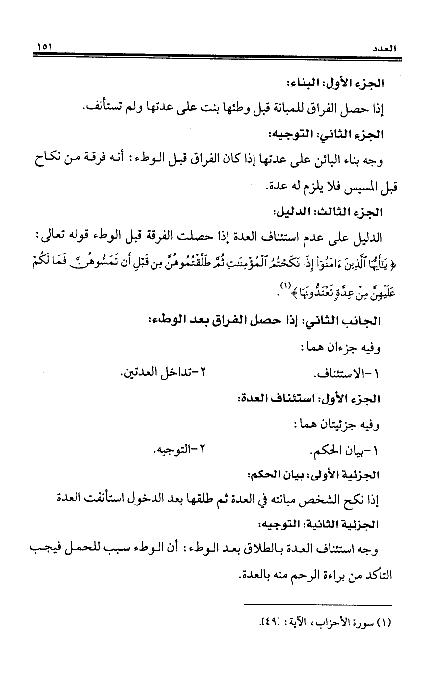 الدليل على عدم استئناف العدة إذا حصلت الفرقة قبل الوطء قوله تعالى: {يَاأَيُّهَا الَّذِينَ آمَنُوا إِذَا نَكَحْتُمُ الْمُؤْمِنَاتِ ثُمَّ طَلَّقْتُمُوهُنَّ مِنْ قَبْلِ أَنْ تَمَسُّوهُنَّ فَمَا لَكُمْ عَلَيْهِنَّ مِنْ عِدَّةٍ تَعْتَدُّونَهَا} (¬1).