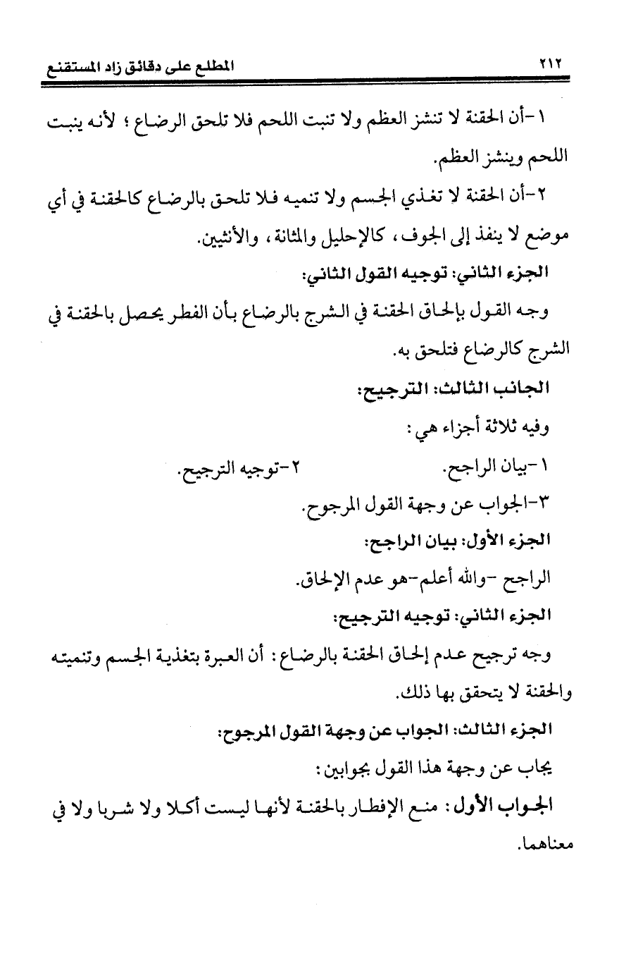 وجه ترجيح عدم إلحاق الحقنة بالرضاع: أن العبرة بتغذية الجسم وتنميته والحقنة لا يتحقق بها ذلك.