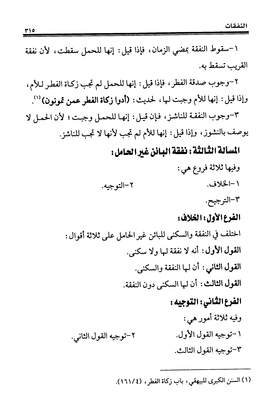 3 - وجوب النفقة للناشز، فإن قيل: إنها للحمل وجبت؛ لأن الحمل لا يوصف بالنشوز، وإذا قيل: إنها للأم لم تجب لأنها لا تجب للناشز.
