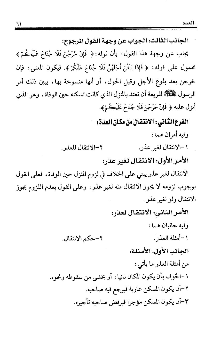 يجاب عن وجهة هذا القول: بأن قوله: {فَإِنْ خَرَجْنَ فَلَا جُنَاحَ عَلَيْكُمْ} محمول على قوله: {فَإِذَا بَلَغْنَ أَجَلَهُنَّ فَلَا جُنَاحَ عَلَيْكُمْ}. فيكون المعنى: فإن خرجن بعد بلوغ الأجل وقبل الحول، أو أنها منسوخة بها، يبين ذلك أمر الرسول - صلى الله عليه وسلم - لفريعة أن تعتد بالمنزل الذي كانت تسكنه حين الوفاة، وهو الذي أنزل عليه {فَإِذَا بَلَغْنَ أَجَلَهُنَّ فَلَا جُنَاحَ عَلَيْكُمْ}.